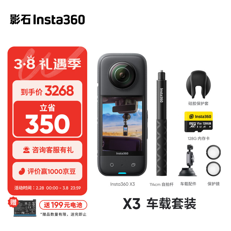 Insta360影石 X3全景运动相机防抖相机5.7K高清360全景摄像机摩托(车载套装)价格:3268.00元!