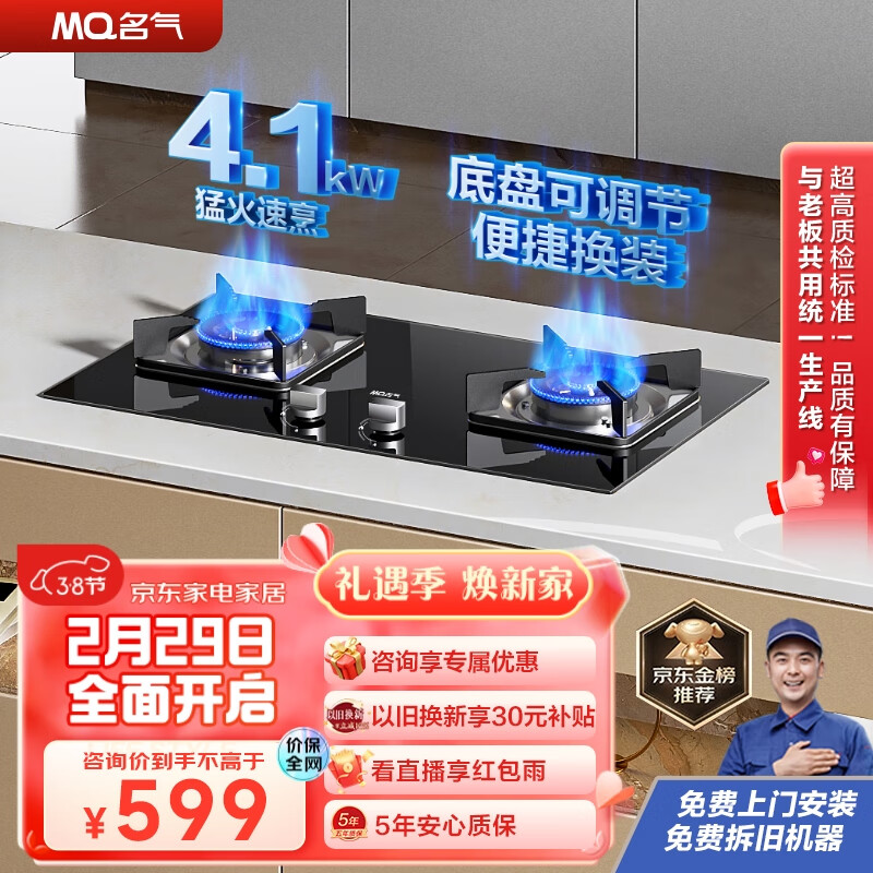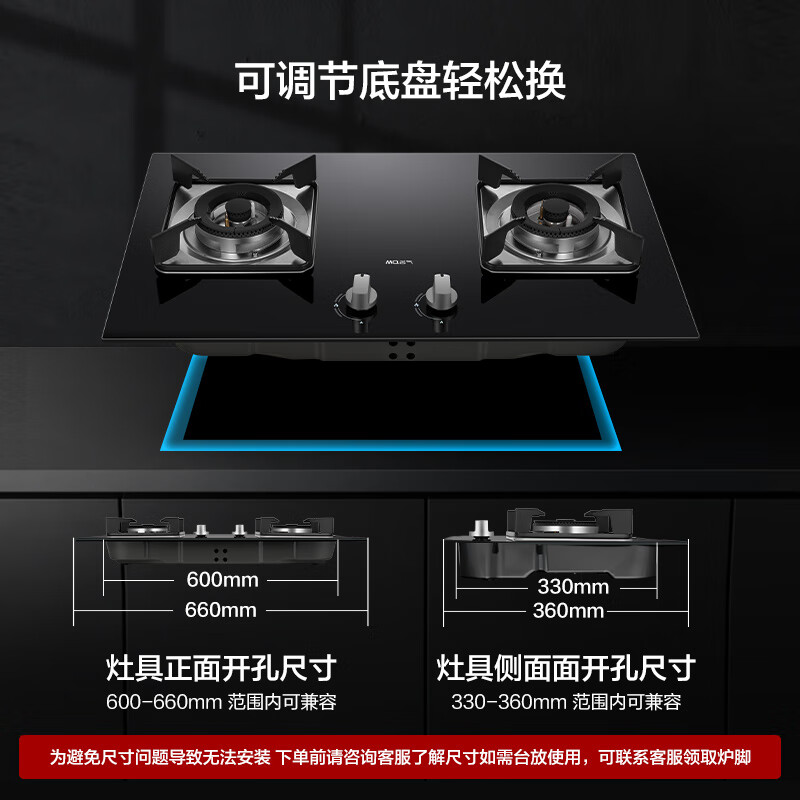 名气(MQ)老板家用燃气灶液化气 嵌入式小尺寸 4.1KW大火力猛火灶 可调节底盘灶具 双灶煤气灶 JZY-A6312B价格:599.00元!