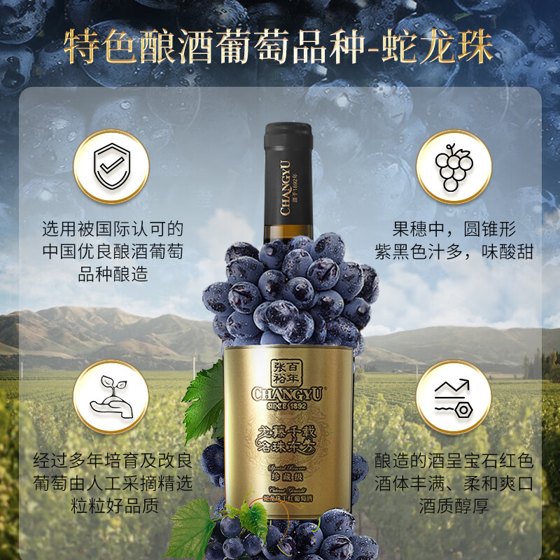 张裕 龙藤名珠 珍藏级蛇龙珠 干红葡萄酒 750ml*6瓶整箱装 国产红酒价格:1045.00元!