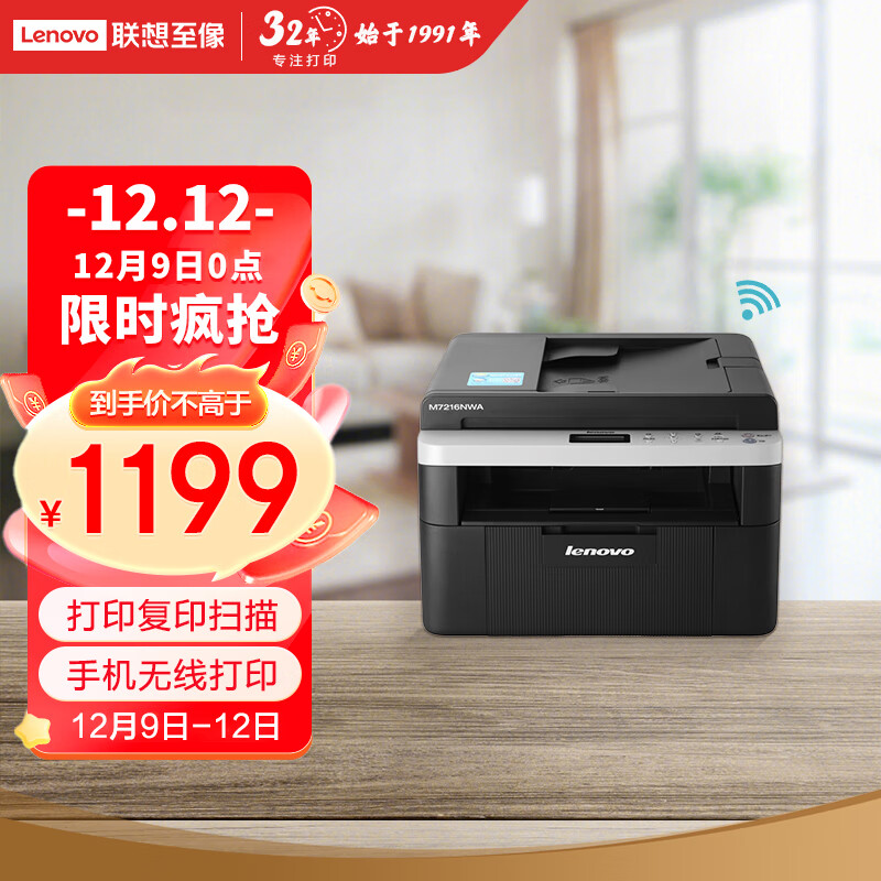 联想(Lenovo)M7216NWA 黑白激光无线打印机商用办公家用 打印复印扫一体机 自动进稿输稿器有线网络价格:1349.00元!