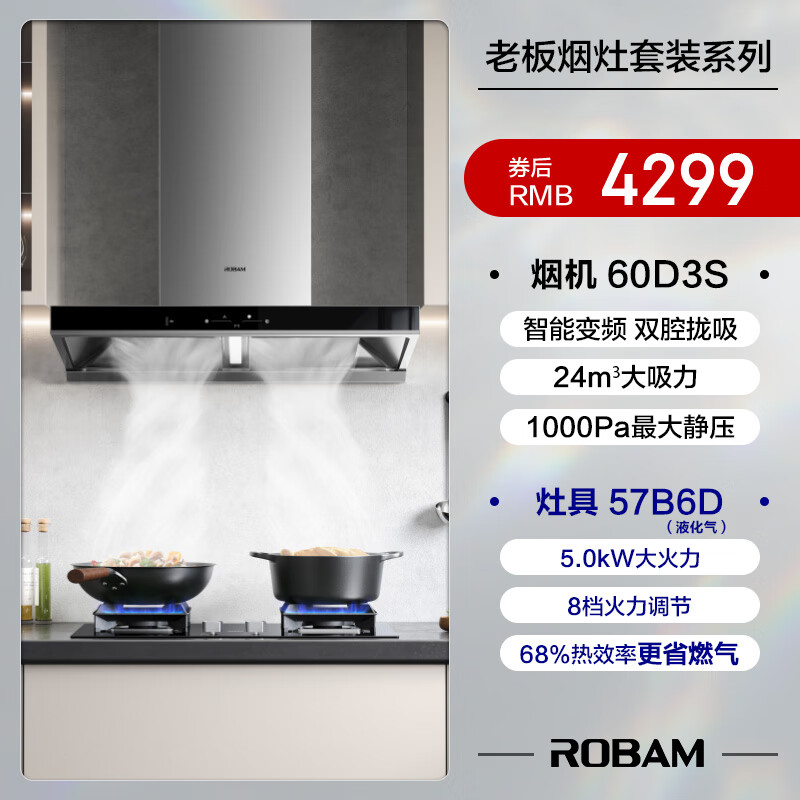 老板(Robam)抽油烟机D3S欧式顶吸双腔变频24大风量家用燃气灶吸油烟机灶具套装60D3S+57B6D(液化气)价格:4899.00元!