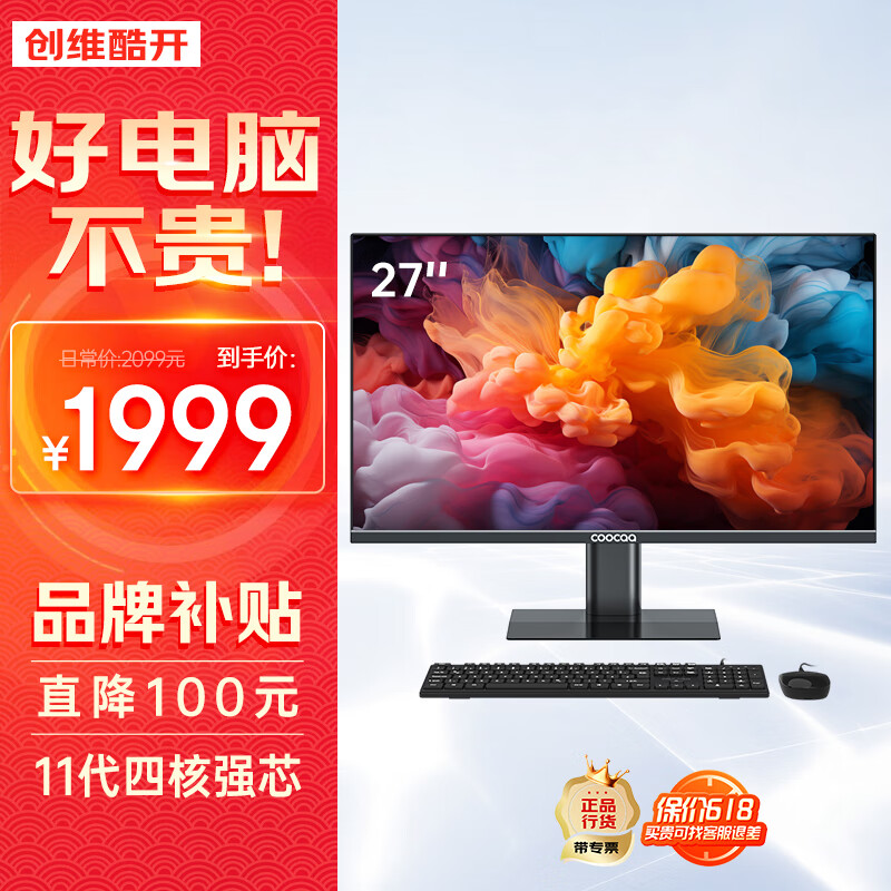 酷开 创维电脑 27英寸办公商用娱乐大屏一体机台式电脑(11代N5095 16G 1TB SSD WiFi5G 蓝牙)价格:1999.00元!