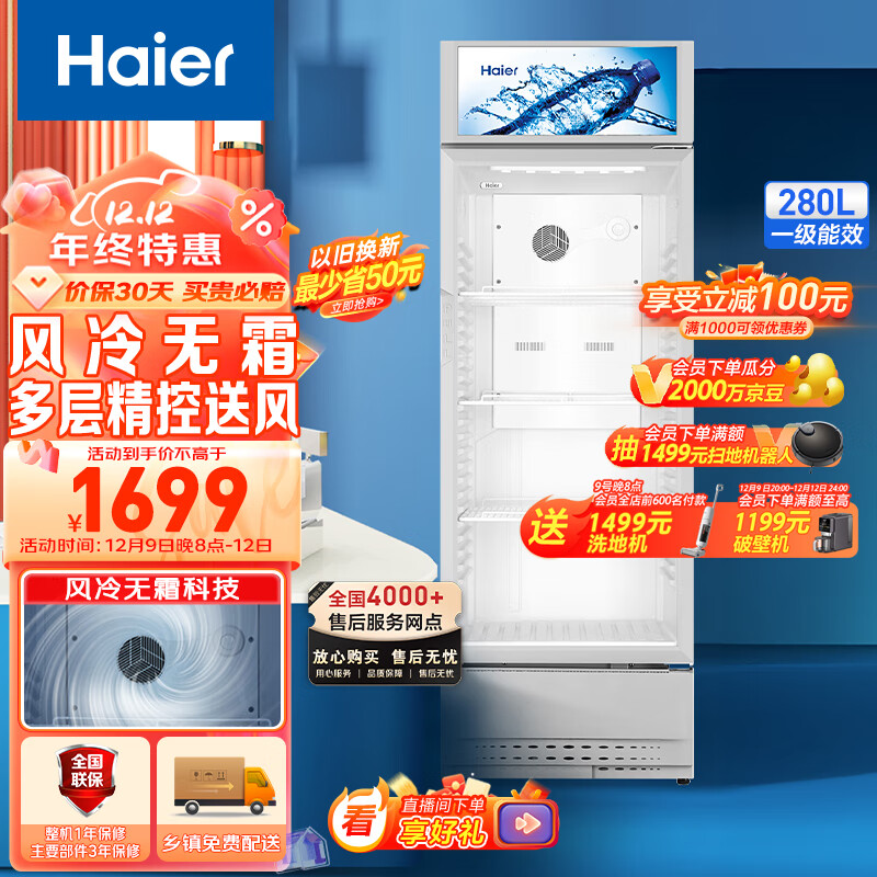 海尔(Haier) 280升风冷无霜立式展示柜冰柜 饮料冷藏柜商用保鲜柜冷柜SC-288DS 以旧换新价格:1799.00元!