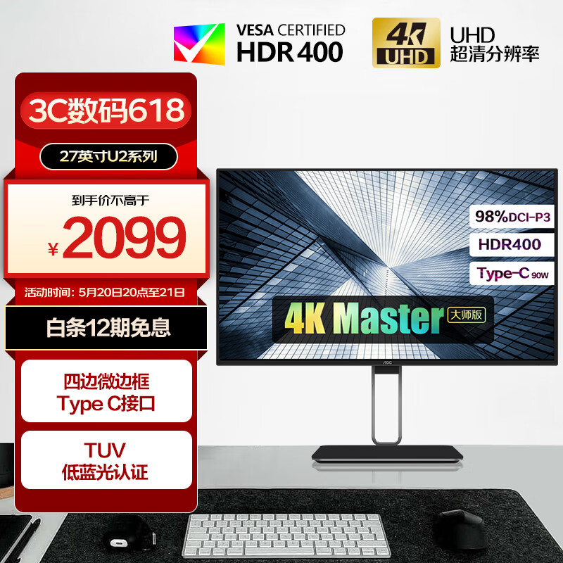 AOC 27英寸 4K Nano IPS 四边微边 HDR400 Type-C接口 90W充电 升降 电脑显示器 焕新升级版 U27U2DS价格:2099.00元!