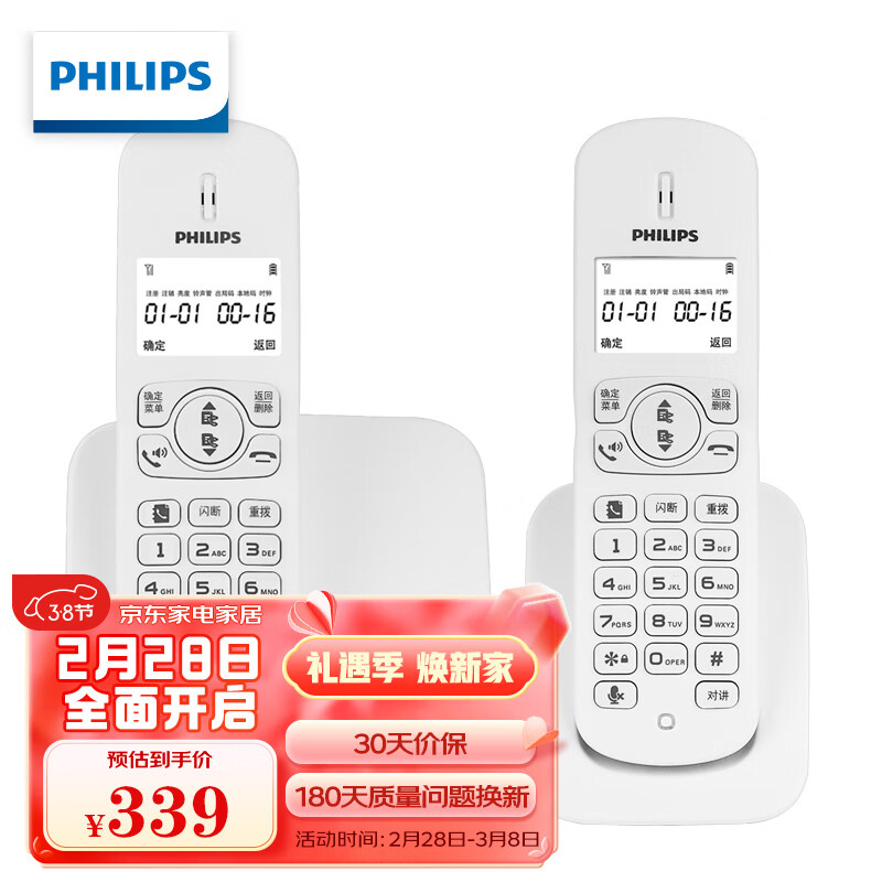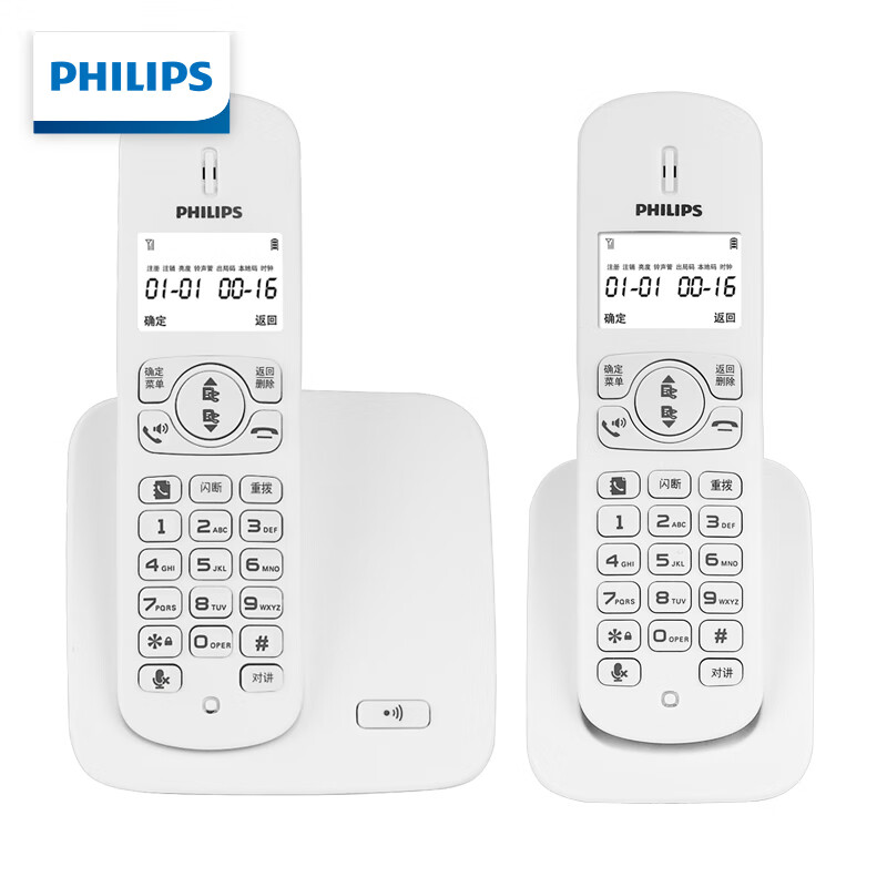 飞利浦(PHILIPS)无绳电话机 无线座机 子母机 办公家用 屏幕白色背光 持久待机 DCTG186(1+1)白色价格:339.00元!