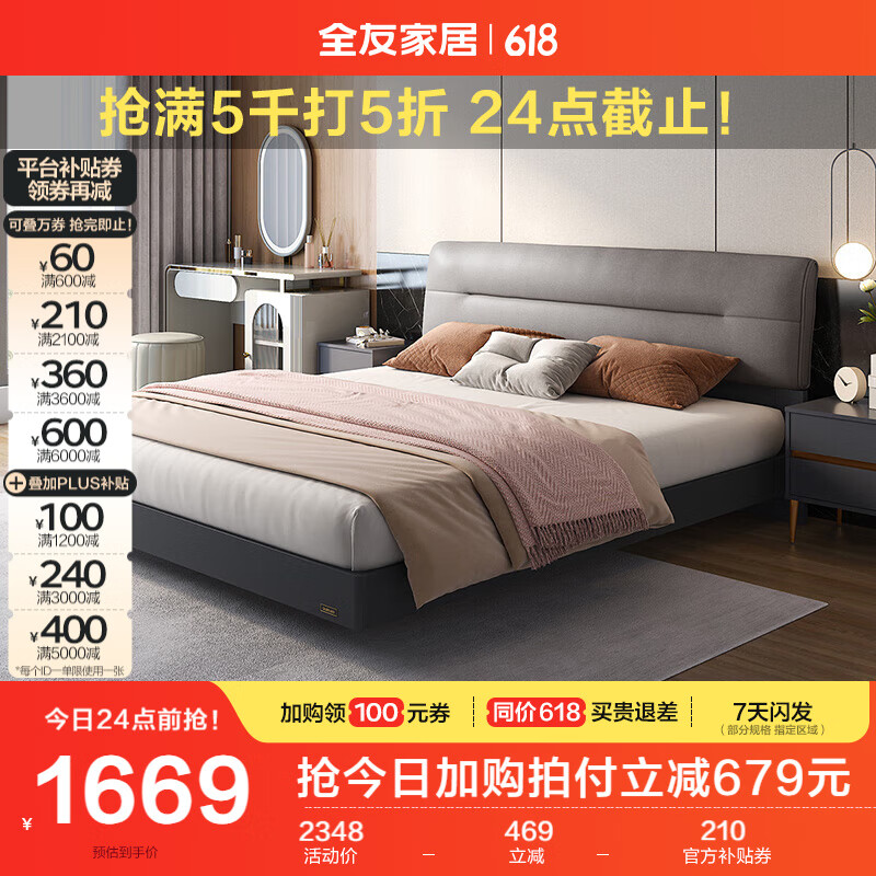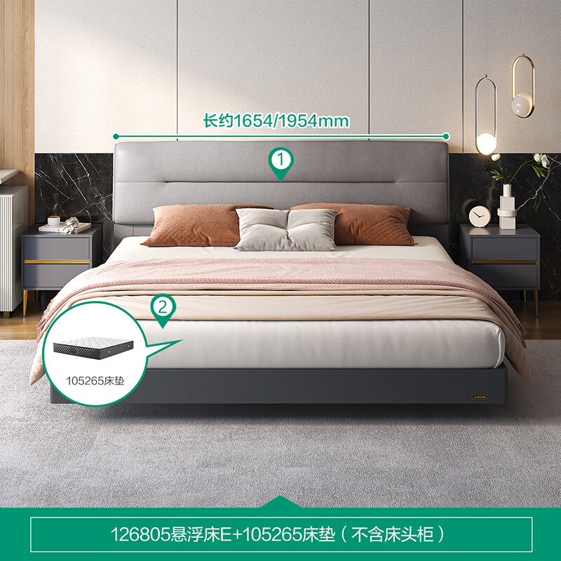 全友家居 主卧室轻奢软包床头板式床悬浮床1.5x2米双人床家具126805价格:2348.75元!