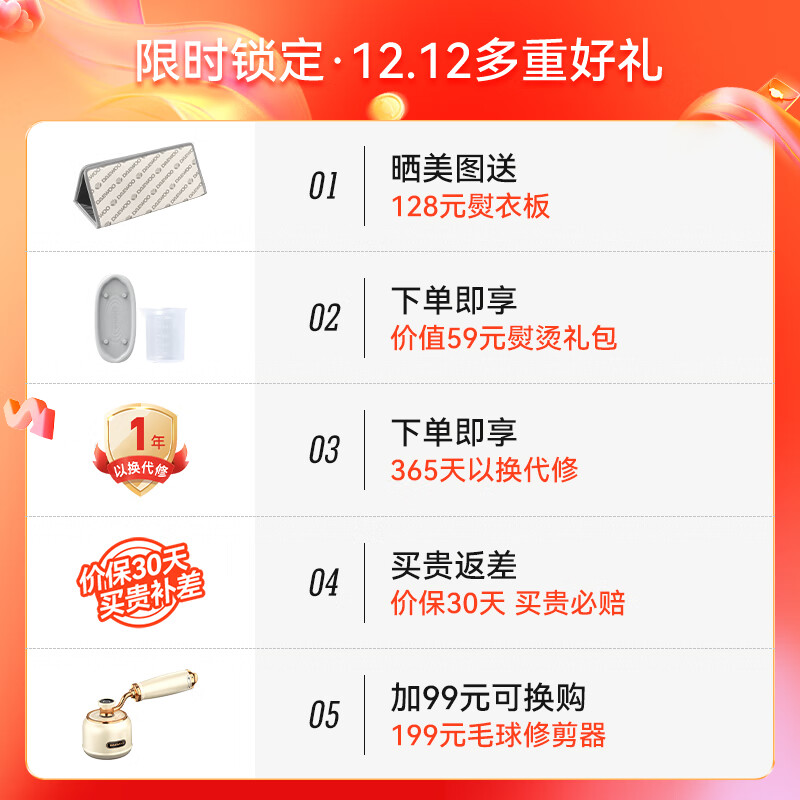 特色功能:快速蒸汽,增压蒸汽,高温除菌,小巧便携,超大蒸汽,水箱清洁,水箱除垢,自动断电