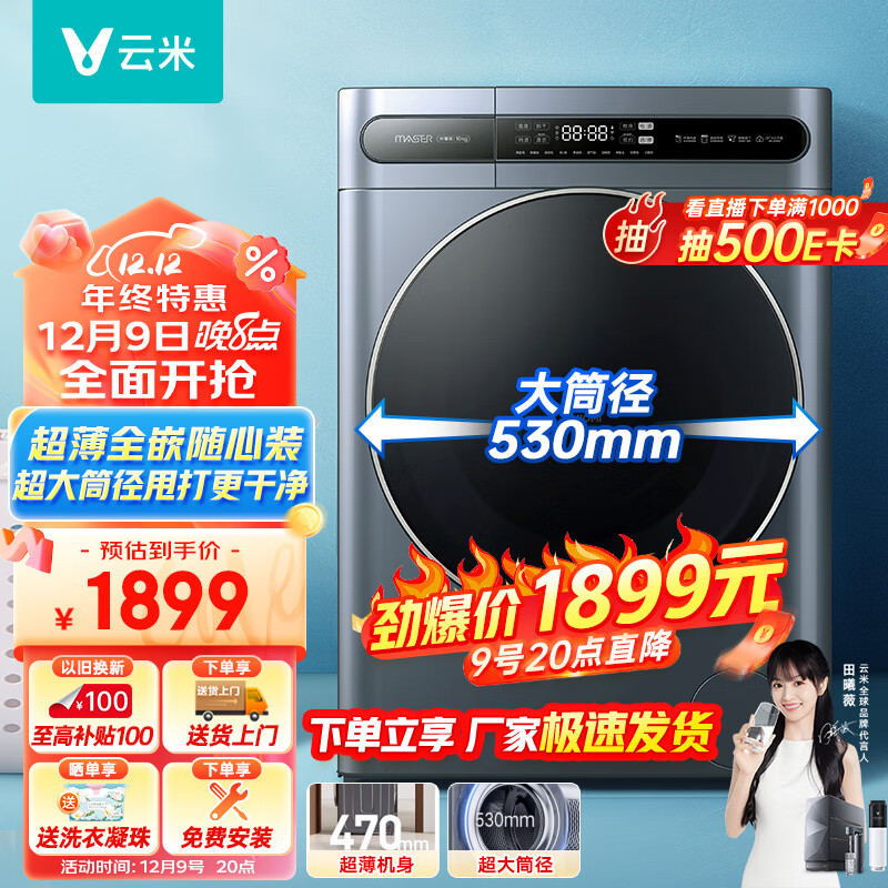 云米(VIOMI)除菌家用滚筒洗衣机全自动 超薄全嵌 10公斤变频大容量 内衣 智能家电 大筒径WM10FE-B6A价格:1999.00元!