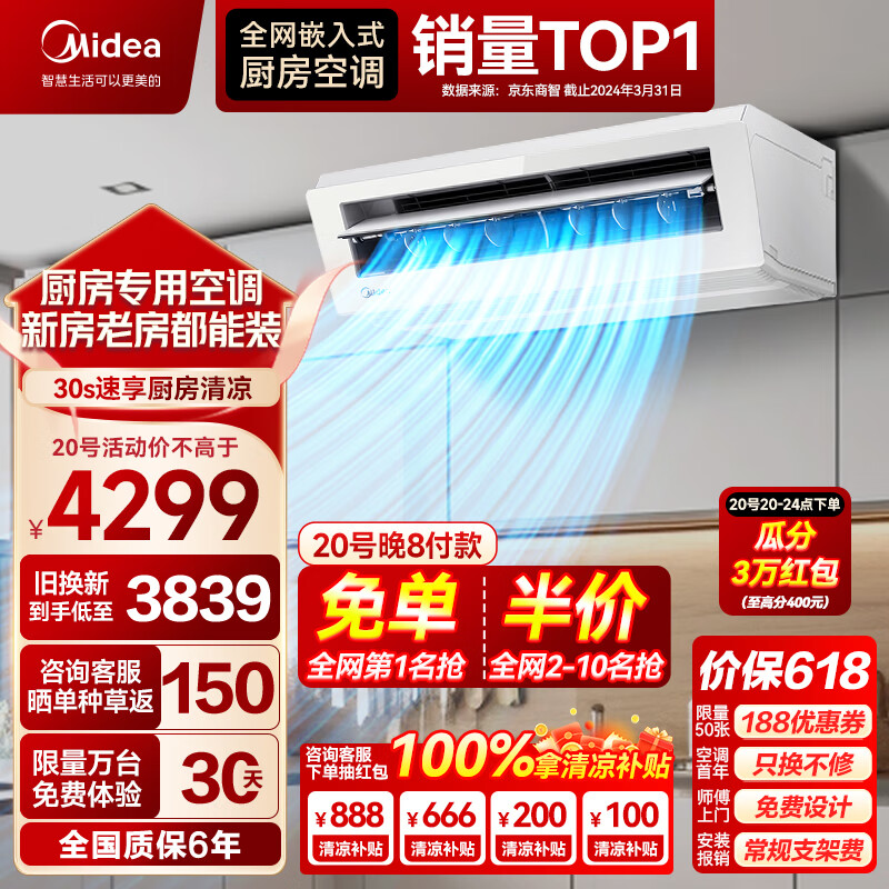 美的(Midea)小凉方 厨房空调 专用吸顶式 1.5匹变频 防油烟 大冷量 易安装CKF-35XW/BN8Y-XD200【极地白】价格:3899.00元!