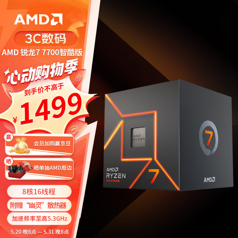 AMD 锐龙7 7700智酷版处理器(r7) 8核16线程 加速频率至高5.3GHz 65W AM5接口 盒装CPU价格:1499.00元!