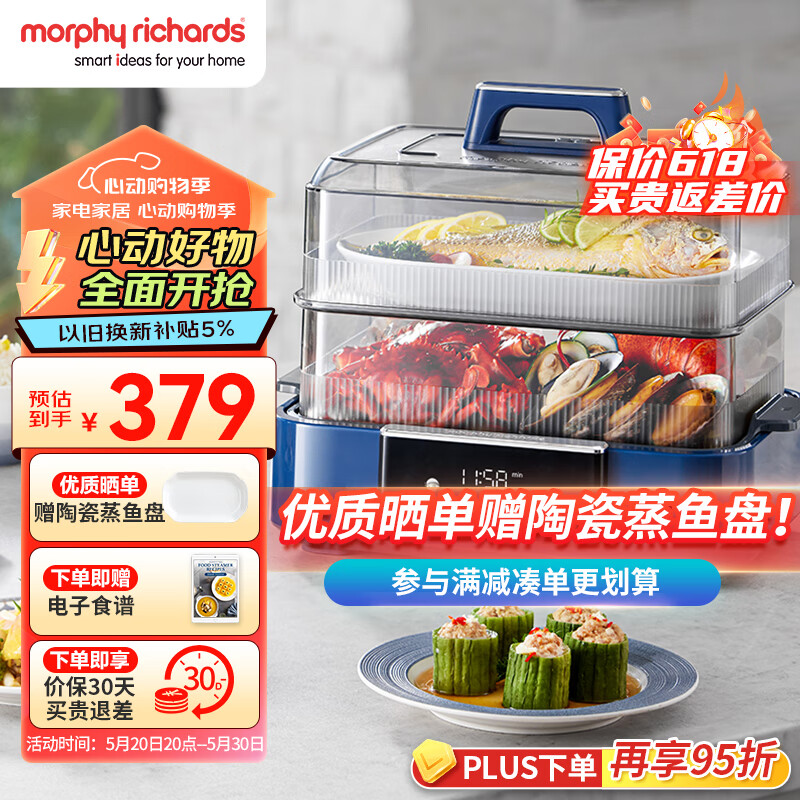 摩飞电器(Morphyrichards)蒸炖锅速蒸锅电蒸锅多功能锅家用12L大容量预约定时保温电炖锅隔水炖煮锅 MR1158 蓝色价格:429.00元!