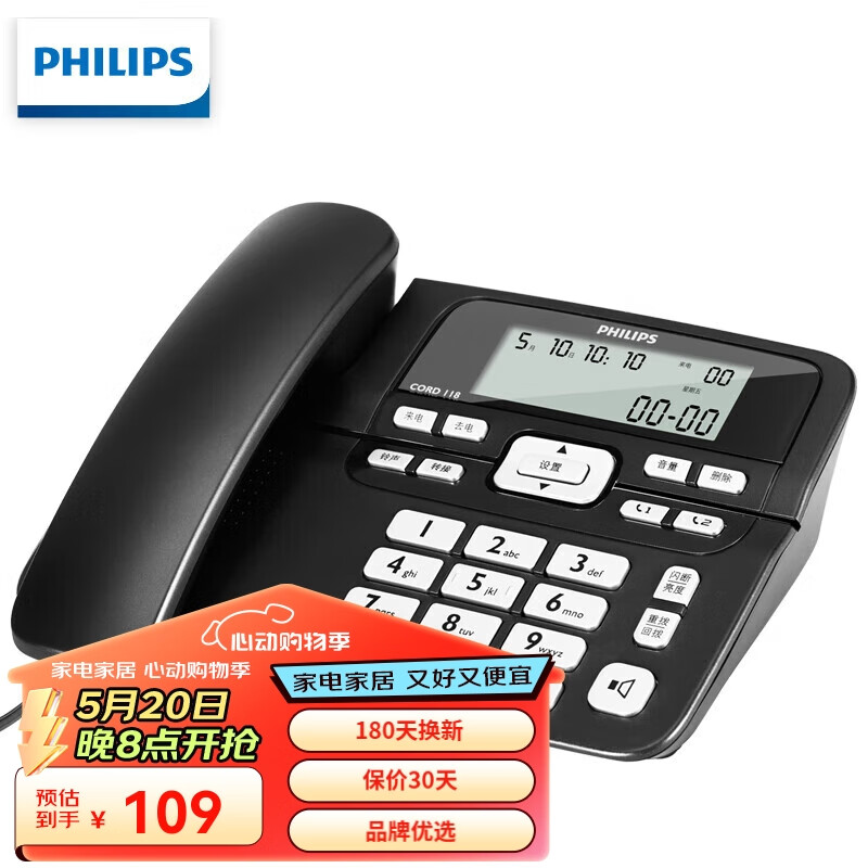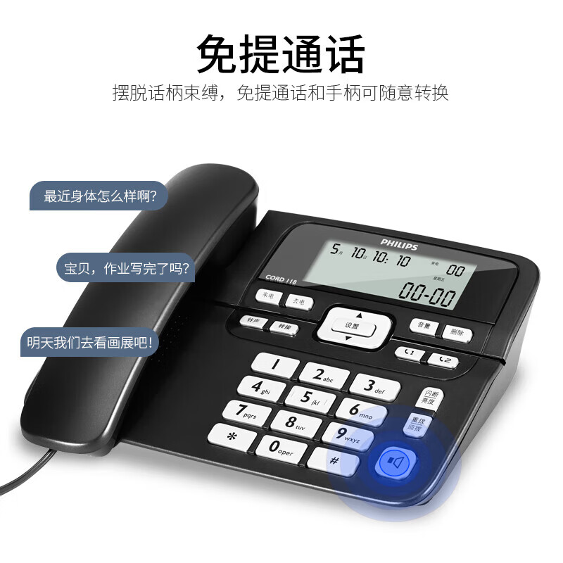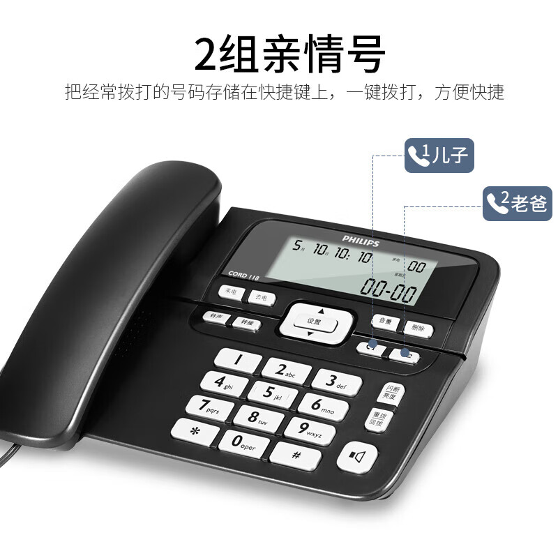 飞利浦(PHILIPS)电话机座机 固定电话 办公家用 一键拨号 长距离免提 来电显示 CORD118商务版黑色价格:109.00元!