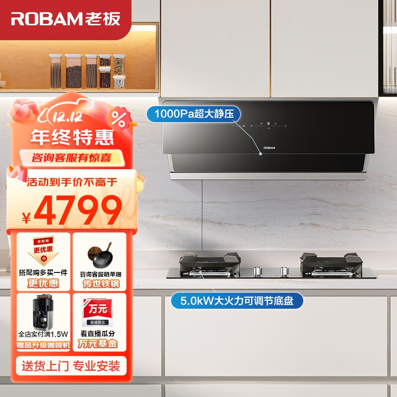 老板(Robam)抽油烟机探索家D7S智能变频聪明吸油烟机家用侧吸24m3/min燃气灶具烟灶套装28D7S+57B2D液化气价格:4799.00元!
