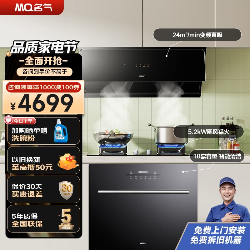 名气(MQ)老板抽油烟机侧吸变频油烟机烟灶套装家用24吸力960静压燃气灶洗碗机三件天然气S1+A6812B+091W价格:4799.00元!