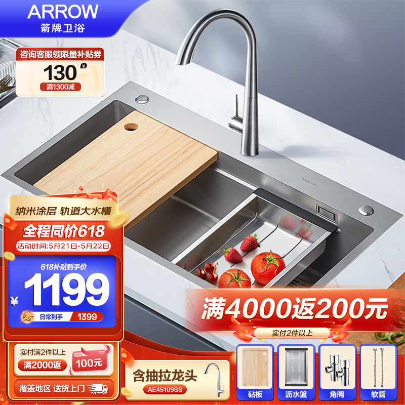 箭牌(ARROW)304不锈钢加厚轨道大单槽厨房洗碗洗菜盆AE5578424G31-NC纳米银价格:1479.00元!