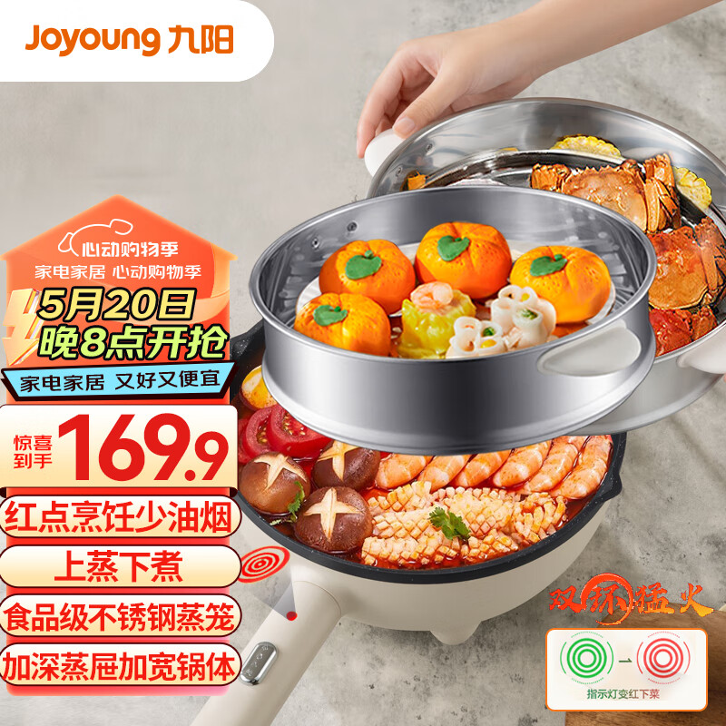 九阳(Joyoung)电炒锅电火锅电煮锅电蒸锅 电锅一体多功能炒菜多用途家用大功率电热爆炒3L HG30-GC30S配蒸笼价格:169.90元!