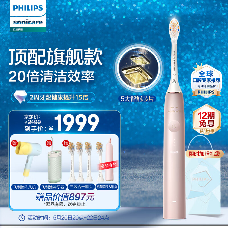 飞利浦(PHILIPS)电动牙刷520礼物情侣送男/女友 含充电旅行盒20倍清除牙菌斑智能感应钻石AI刷旗舰款茱萸粉HX9996价格:2199.00元!