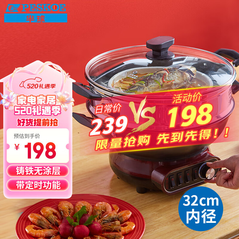 半球(Peskoe)电蒸锅定时款电炒锅加厚铸铁电锅多用途锅多功能电热锅 电火锅电煮锅DT4-34价格:198.00元!