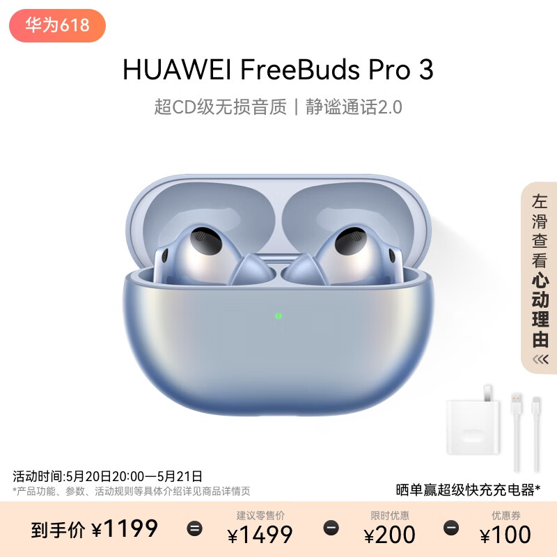 华为(HUAWEI)FreeBuds Pro 3 真无线蓝牙降噪耳机 入耳式动态降噪/游戏影音/离线查找/适用Mate 60 星河蓝价格:1299.00元!