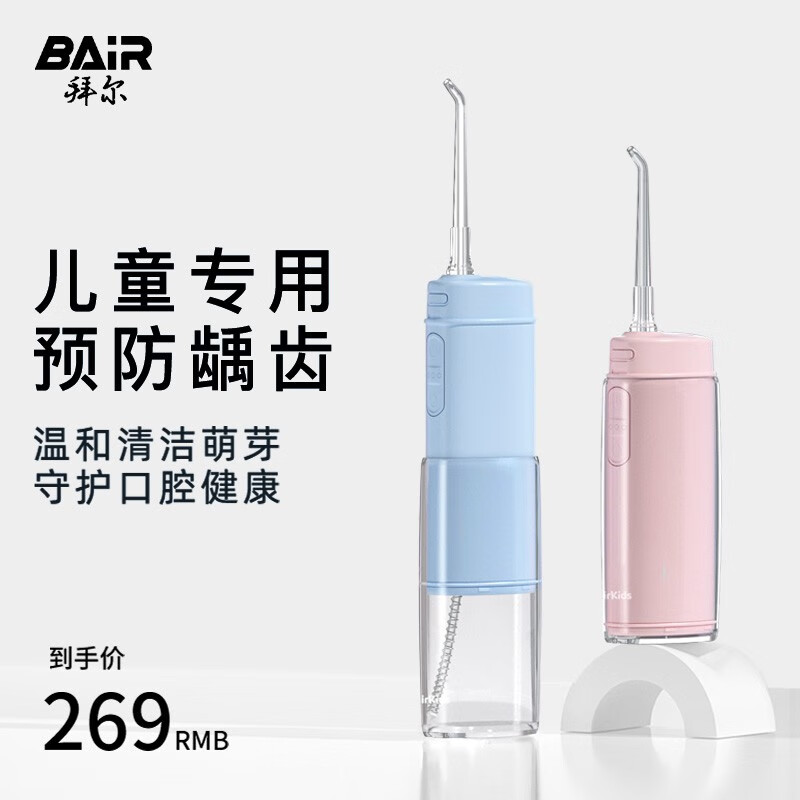 拜尔(BAIR) V2k 6-10-12岁儿童专用电动冲牙器家用便携式正畸牙齿清洁器 小孩洗牙器神器水牙线冲洗器洁牙器 萌动蓝-配儿童专用 4支喷头价格:258.00元!