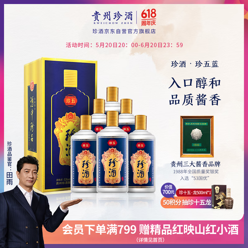珍酒珍五蓝 酱香型白酒 53度 500ml*6瓶 整箱装酒中珍品珍贵酱香价格:990.00元!