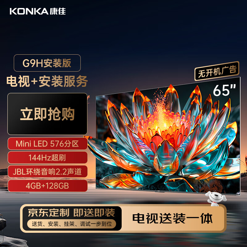 康佳电视65G9H 65英寸【包安装版】 Mini LED 576分区 智能液晶平板电视机【服务套装】送装一体含挂架价格:4738.00元!