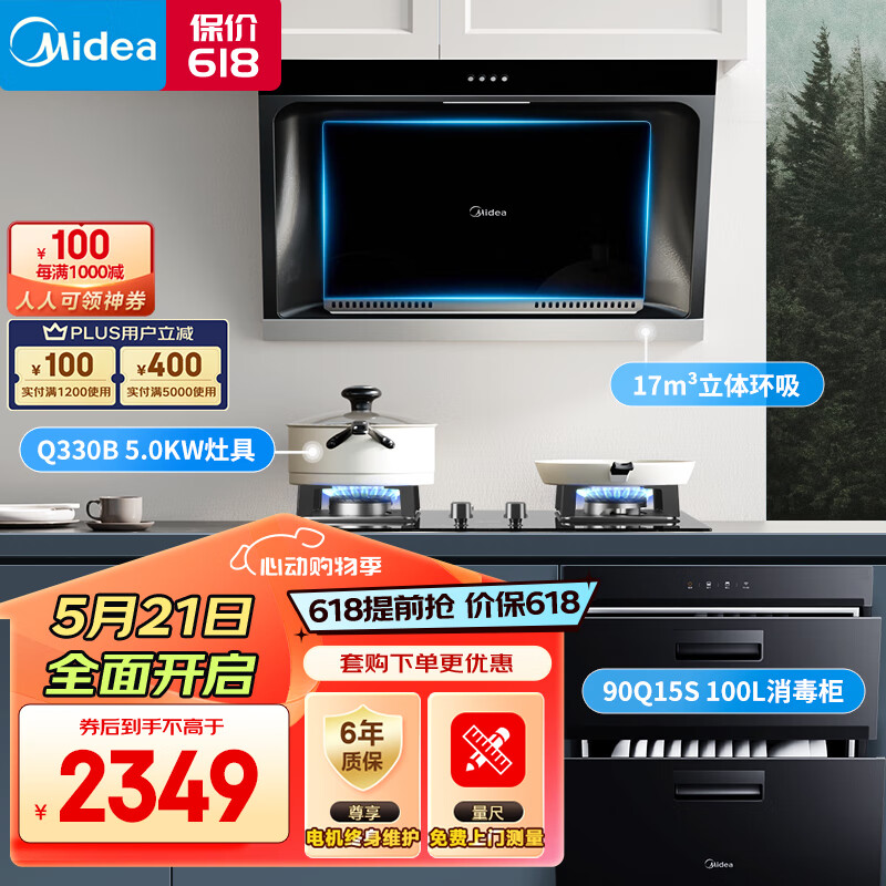 美的(Midea)抽油烟机侧吸17m3大吸力油烟机台嵌两用双灶天然气灶具100L消毒柜厨房三件套J30+Q330+90Q15S价格:2549.00元!