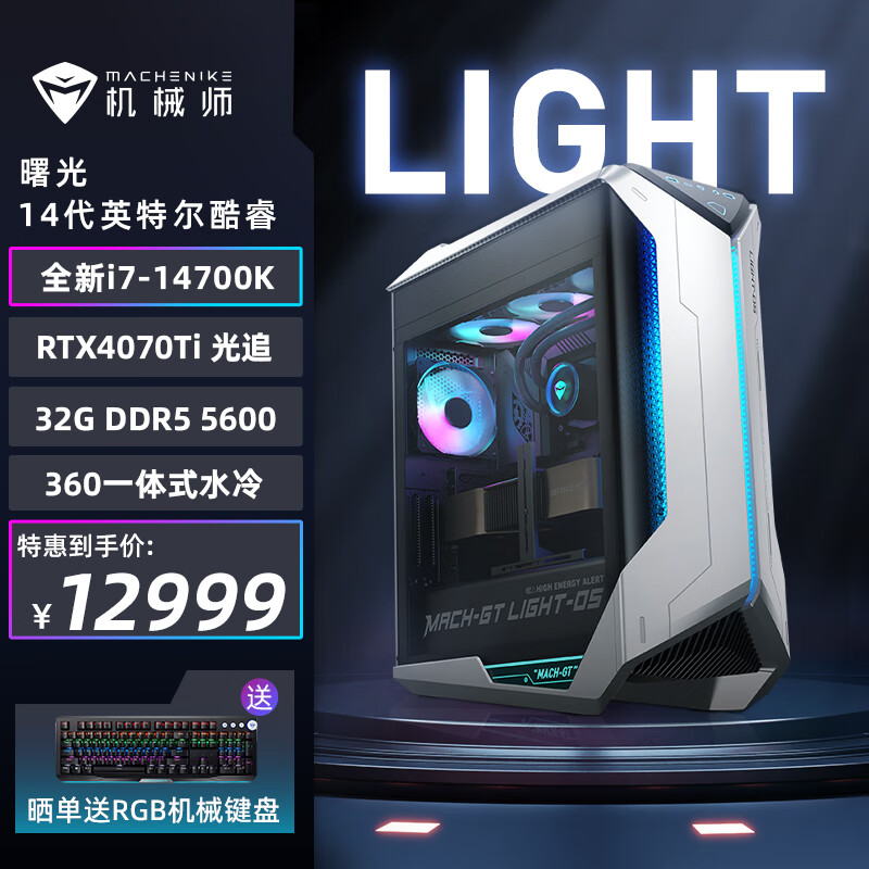 机械师(MACHENIKE)曙光 游戏台式机电脑电竞主机(14代i7-14700K 32G DDR5 5600 1TSSD RTX4070Ti)360水冷价格:12999.00元!