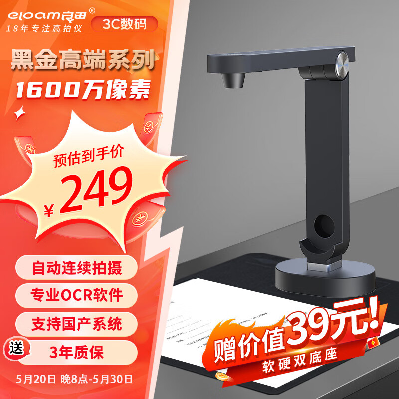 良田(ELOAM)高拍仪 1600万高清像素 A4办公高速连续扫描仪 OCR文字识别 自动纠偏 便携S1086L价格:316.00元!