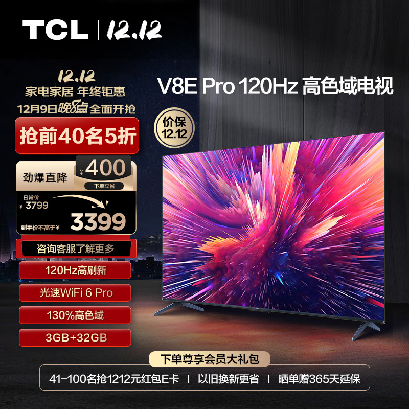 TCL电视 75V8E Pro 75英寸 120Hz WiFi 6 Pro 免遥控AI声控 4K大屏屏 高色域 液晶智能平板电视机价格:3499.00元!