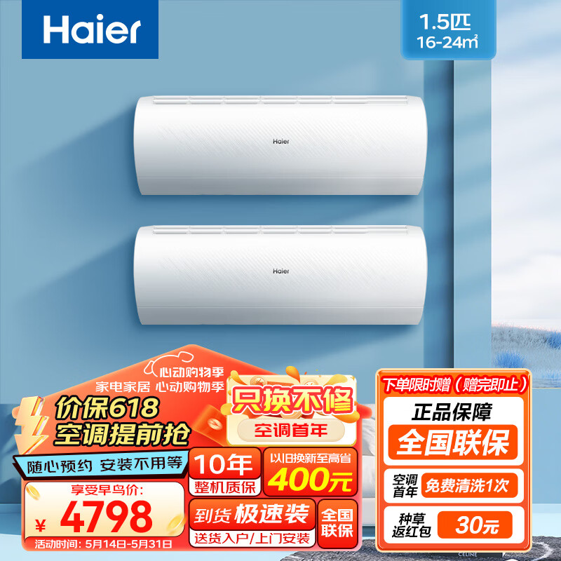 海尔(Haier)空调套装挂机1.5匹*2台 新一级能效节能省电 急速冷暖变频空调 壁挂式家用卧室 自清洁价格:4798.00元!