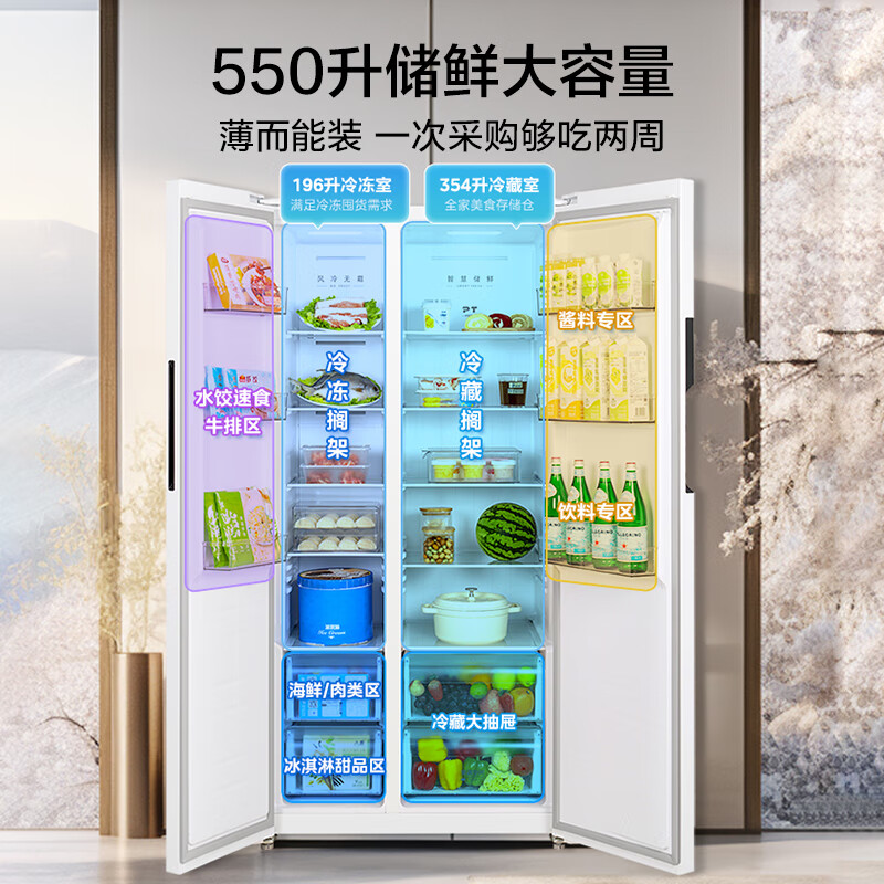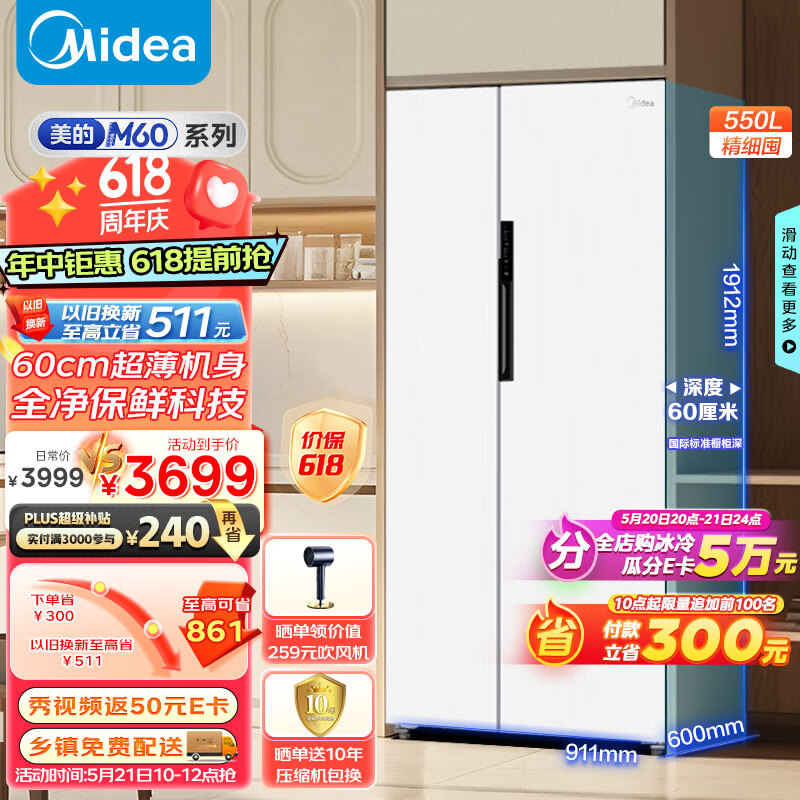 美的(Midea)M60系列60cm薄577对开门双开门一级能效双变频家用风冷无霜白色电冰箱节能MR-577WKPZE超大容量价格:3999.00元!