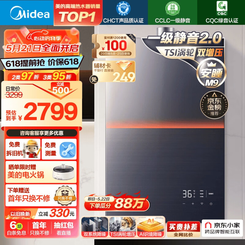 美的(Midea)安睡M9系列16升燃气热水器天然气 一级静音2.0低噪增容水伺服 四段微火恒温 TSI增压JSQ30-M9 Max价格:2999.00元!