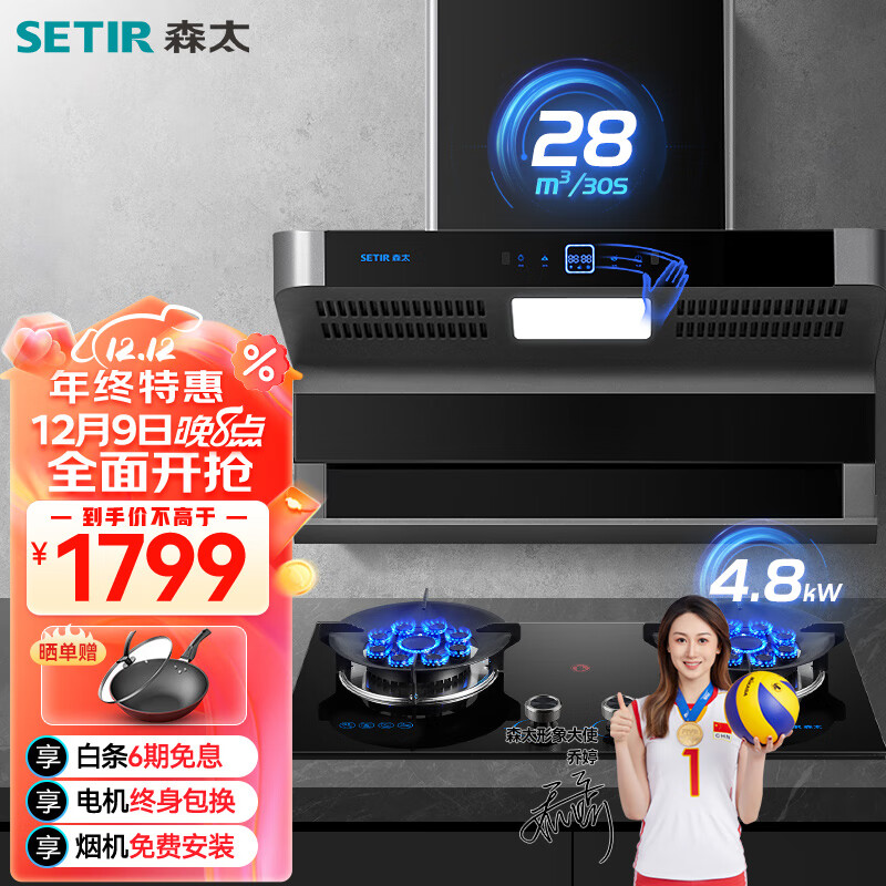 森太(SETIR)顶侧双吸烟灶套装 小户型智能变频大吸力家用抽油烟机 4.8kW九头猛火燃气灶 B812BQL+T282 液化气价格:2099.00元!