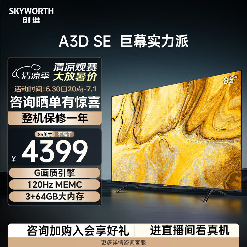 创维电视85A3D SE85英寸电视机G画质引擎3+64G 120Hz MEMC远场语音护眼平板液晶巨幕大屏价格:4399.00元!