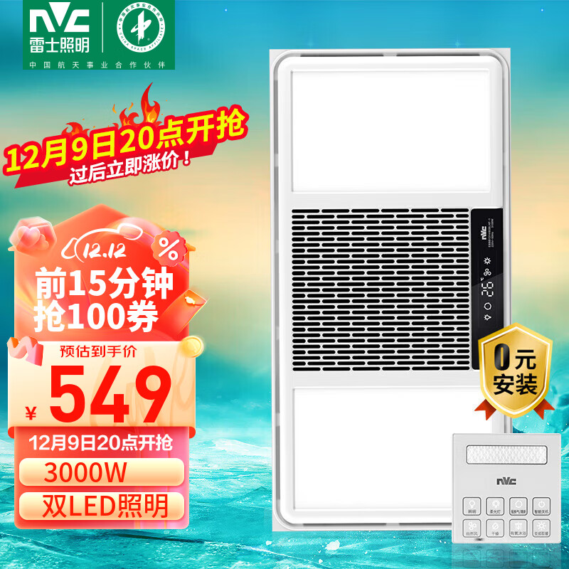 雷士(NVC)智能人感双LED灯浴霸暖风照明排气一体浴室取暖器卫生间集成吊顶价格:999.00元!