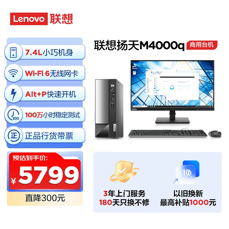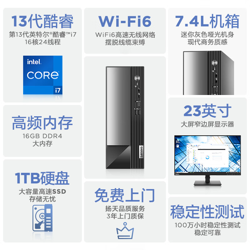 联想(Lenovo)扬天M4000q 商用办公台式电脑主机(酷睿13代i7-13700 16G 1TB SSD)23英寸价格:5799.00元!
