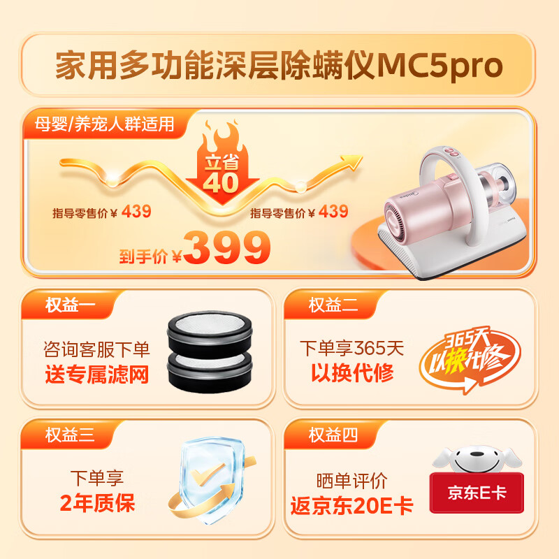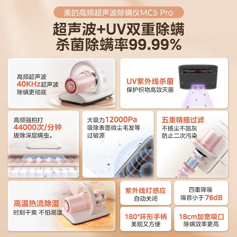 美的(Midea)除螨仪家用 超声波紫外线除螨杀菌 手持床上吸尘MC5pro价格:399.00元!