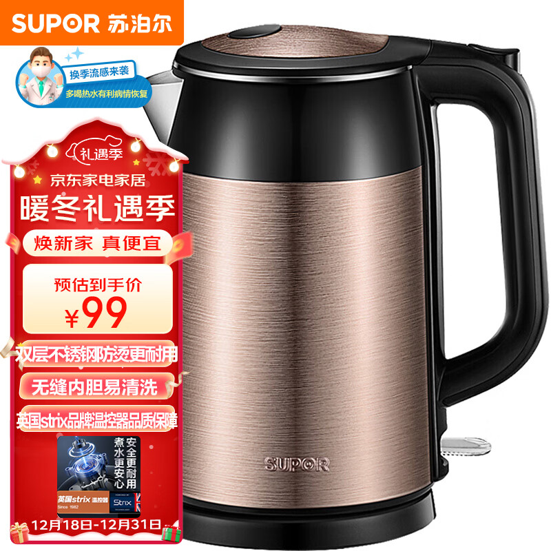 苏泊尔(SUPOR)电水壶热水壶 1.7L全钢无缝双层防烫电热水壶 304不锈钢烧水壶 SWF17E13B价格:99.00元!