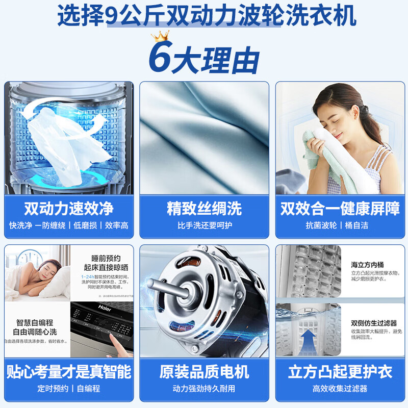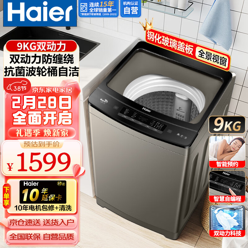海尔(Haier)波轮洗衣机全自动9KG公斤双动力防缠绕租房家用节能纯净洗智慧自编程智能预约小型洗衣机Z128价格:1599.00元!