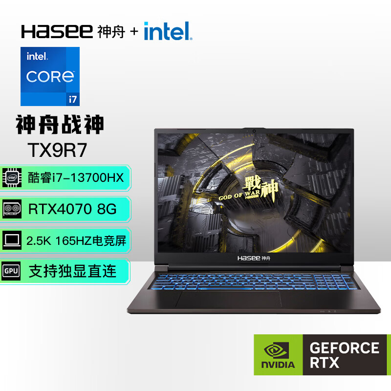神舟(HASEE)战神TX9R7 13代英特尔酷睿i7 16英寸笔记本电脑(13代i7-13700HX RTX4070 165Hz 2.5K电竞屏)价格:7499.00元!
