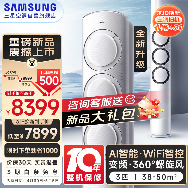 三星空调3匹新三级能效AI智能语音柜机立式全直流变频WIFI冷暖空调38-50㎡适用以旧换新KFR-72L/EMG3价格:8899.00元!