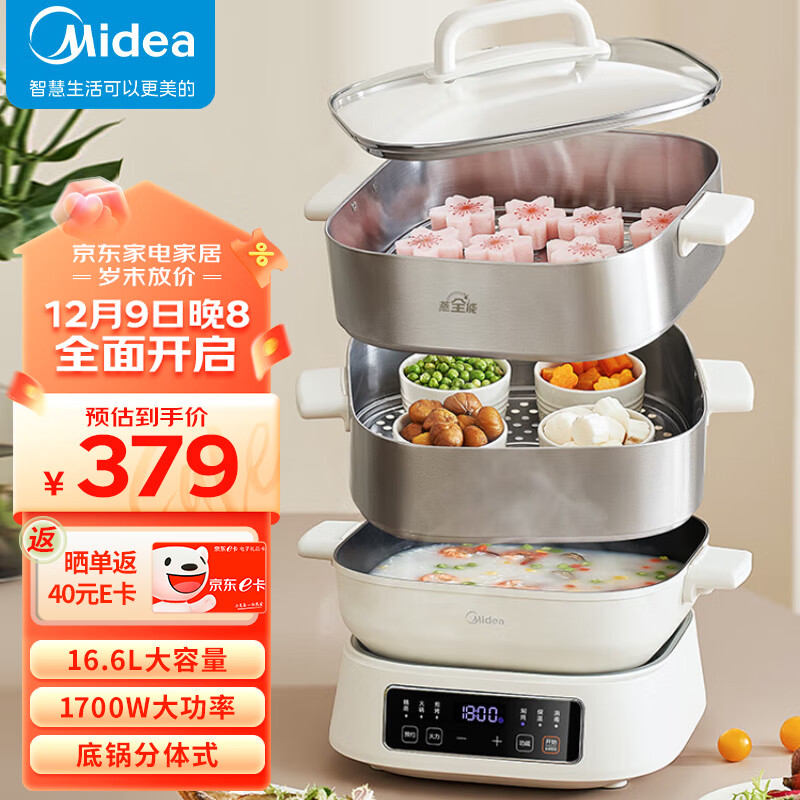 美的(Midea)电蒸锅 电煮锅 电火锅 多功能锅家用电锅蒸包子锅蒸全能三层大容量多用途锅 ZGC282802价格:399.00元!