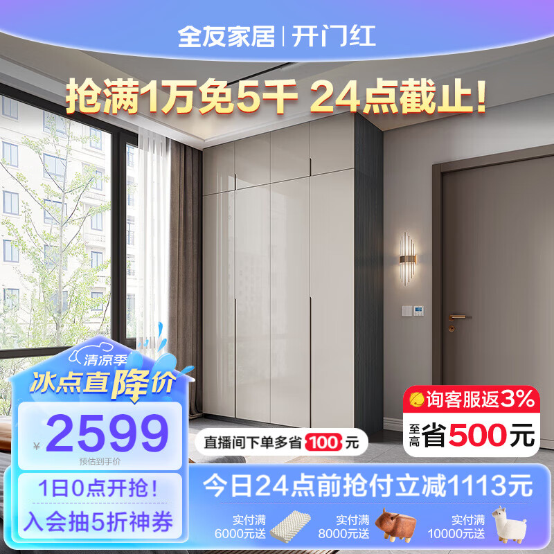 全友家居 衣柜卧室极简风模块化收纳智能感应灯平开门储物柜子DG10010价格:3712.86元!