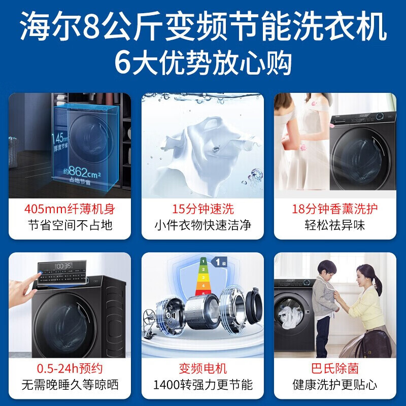海尔(Haier)8KG全自动滚筒变频洗衣机 超薄洗衣机 家用大容量大筒径 巴氏除菌 香薰洗护 洗脱一体机 以旧换新价格:2299.00元!
