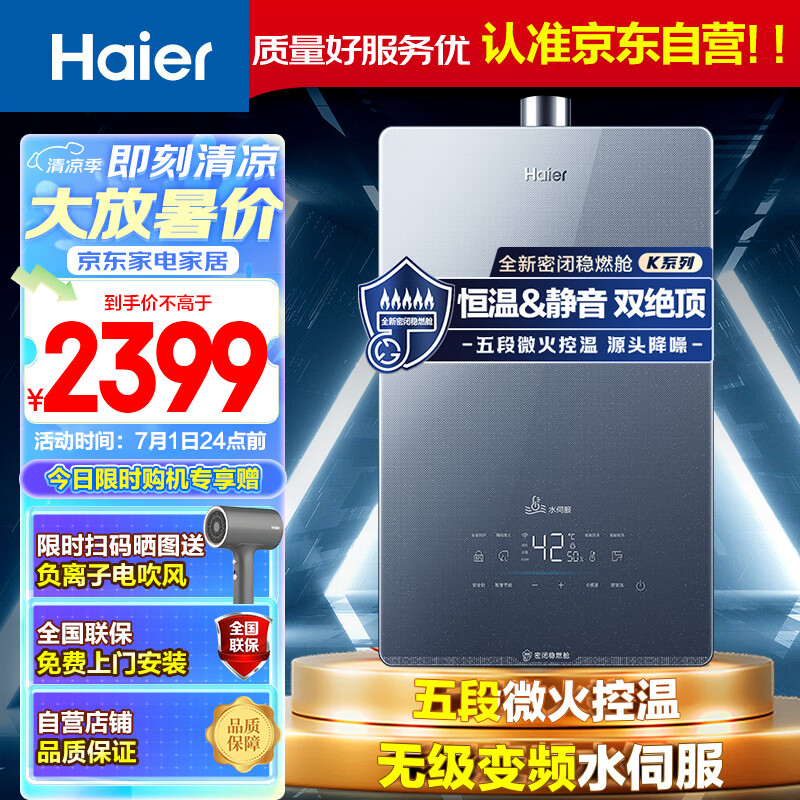 海尔(Haier)16升【K系列KL5】燃气热水器天然气 无级变频水伺服 五段微火 静音JSQ31-16KL5锦绣U1【以旧换新】价格:2599.00元!