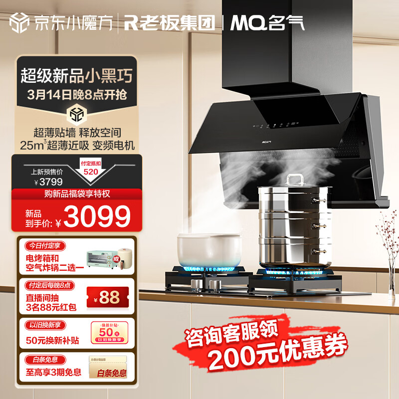 名气小黑巧X7老板抽油烟机家用超薄近吸侧吸变频25风量大吸力5.0定时燃气灶具烟灶套装X7+6820天然气价格:3099.00元!