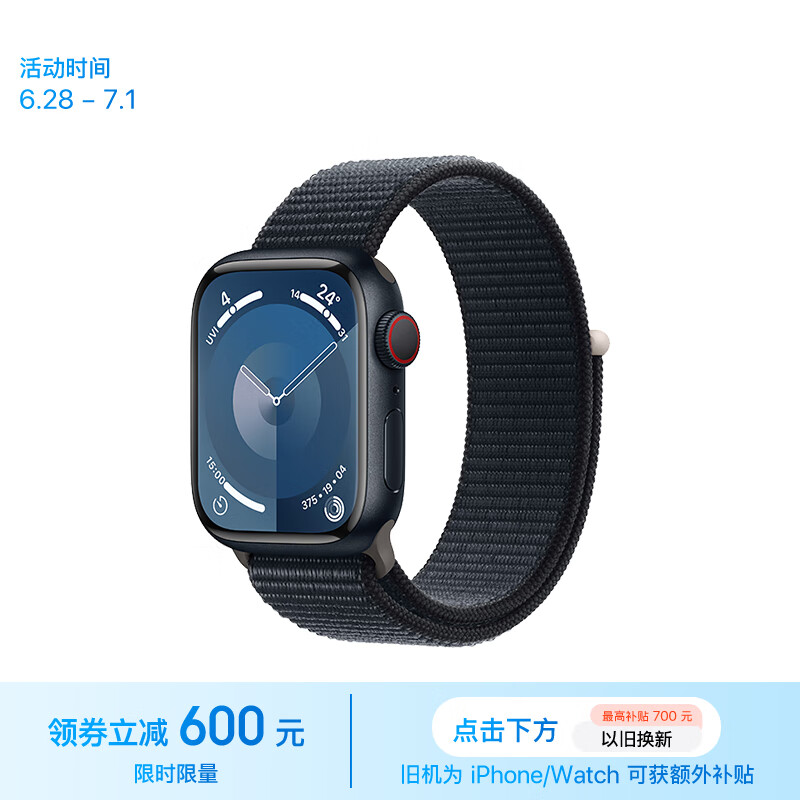 Apple/苹果 Watch Series 9 智能手表GPS+蜂窝款41毫米午夜色铝金属表壳午夜色回环式表带 MRJK3CH/A价格:3799.00元!
