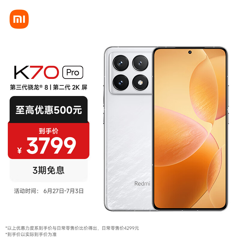 小米Redmi K70 Pro 第三代骁龙8 小米澎湃OS 24GB+1T 晴雪 红米5G手机 SU7小米汽车互联 AI手机价格:3799.00元!