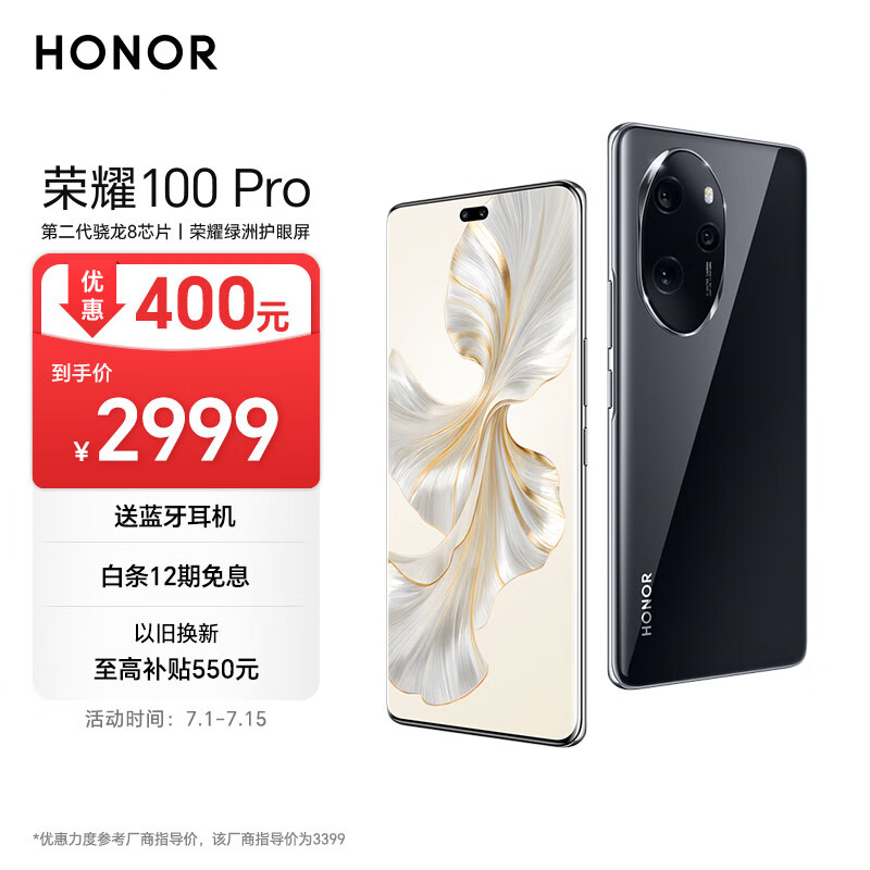 荣耀100 Pro 单反级主摄 荣耀绿洲护眼屏 第二代骁龙8旗舰芯片 AI手机 12+256 亮黑色 5G价格:2999.00元!